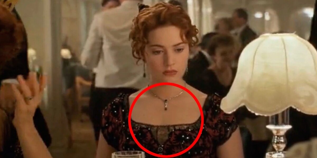 В ходе первого ужина на лайнере Роза сидит за столом возле своего жениха и матери. Героиня одета в платье, украшенное бисером, а на ее шее видно ожерелье. Однако уже в следующей сцене, когда она решает спрыгнуть с корабля и бежит по палубе, украшения на шее актрисы больше нет.