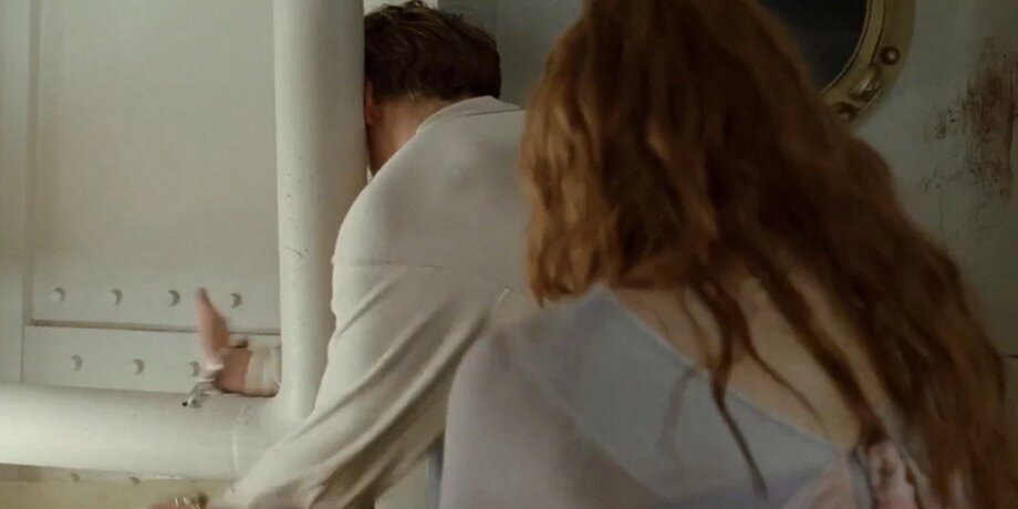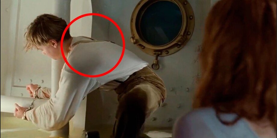 Когда Роза приходит спасти Джека, прикованного к трубе наручниками телохранителем Каледона Хокли, герой, как и на прошлых кадрах фильма, одет в белую свободную рубашку и брюки, которые закреплены подтяжками. Он просит Розу сперва ударить топором по шкафу, чтобы после этого разбить наручники. Однако героиня вновь оборачивается к Джеку, подтяжки пропадают с его спины.