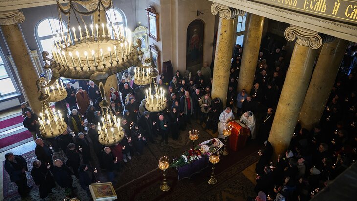 Перед началом отпевания присутствующие возложили цветы на гроб. Похороны пройдут на Смоленском кладбище.