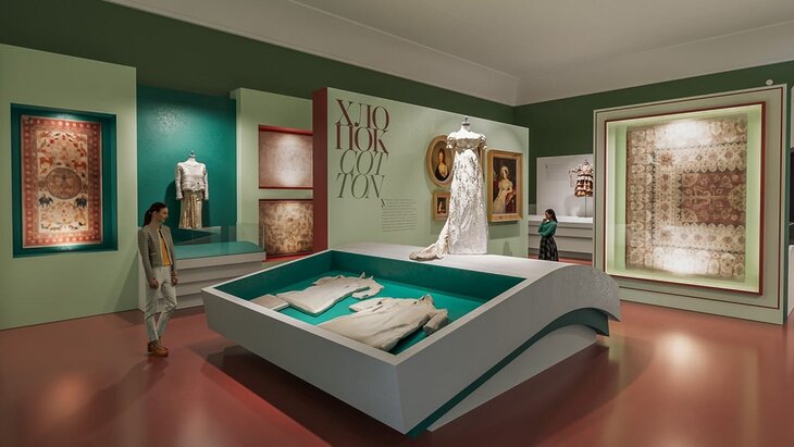 Каждый зал посвятят определенной теме: истории хлопка, шелка, шерсти, вышивке, орнаментам и сари. На площадке, где посетителям расскажут об индийских методах окрашивания, гости узнают о краске индиго. Благодаря ей джинсы стали самой универсальной одеждой в мире. Также в зале будут представлены редкие ручные вышивки, сари, созданные с использованием натурального золота, тюрбаны из тонкого муслина и свадебные покрывала из провинции Пенджаб, расшитые яркими шелками.