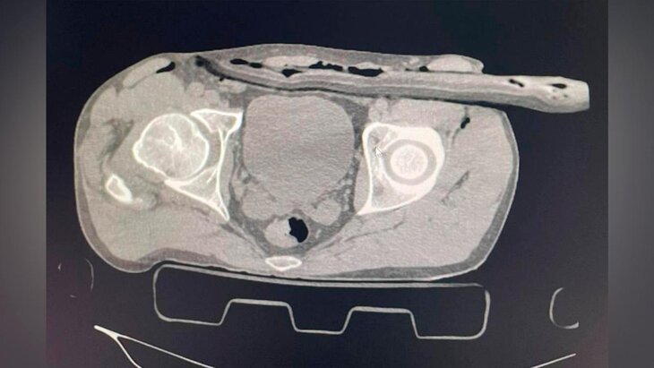 Пострадавший ремонтировал крышу загородного дома без страховки и упал на сук. Ветка прошла через бедро в толщу брюшной стенки. В больнице ему сделали компьютерную томографию и УЗИ, которые показали наличие свободной жидкости в животе.