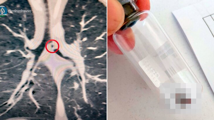 При этом рентген не показал инородное дело. После перевода в областную детскую больницу компьютерная томография (КТ) зафиксировала в бронхах кусок глины. После этого специалистам удалось извлечь его при помощи специальных инструментов.