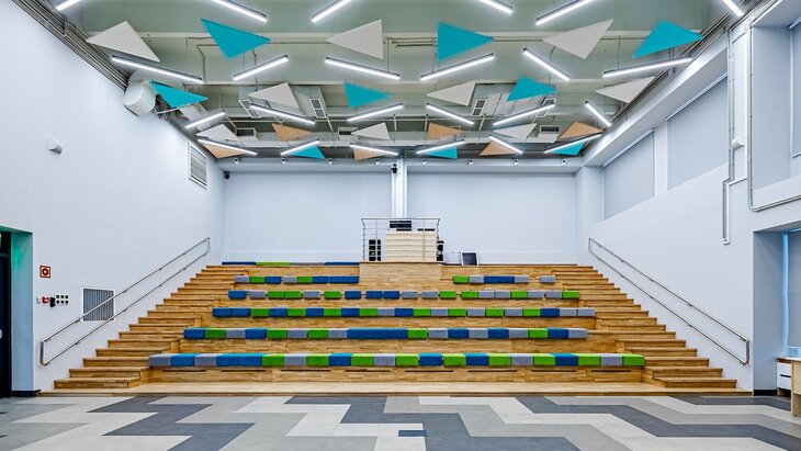 Изменения затрагивают и общественные пространства. Библиотеки превращаются в многофункциональные центры для учебы и общения – медиатеки. Актовые залы трансформируются в универсальные пространства, которые могут использоваться как театры, лектории или площадки для мероприятий.