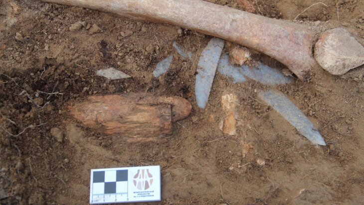 Помимо этого, возле останков обнаружили ножи с рукоятями из кости и вставными лезвиями из кременя. При этом на костяной основе ножа заметен орнамент в виде прочерченной линии.