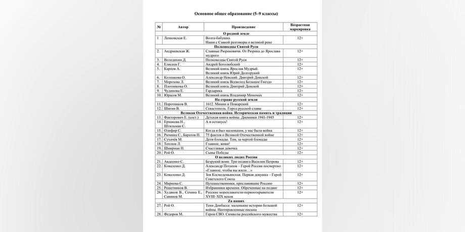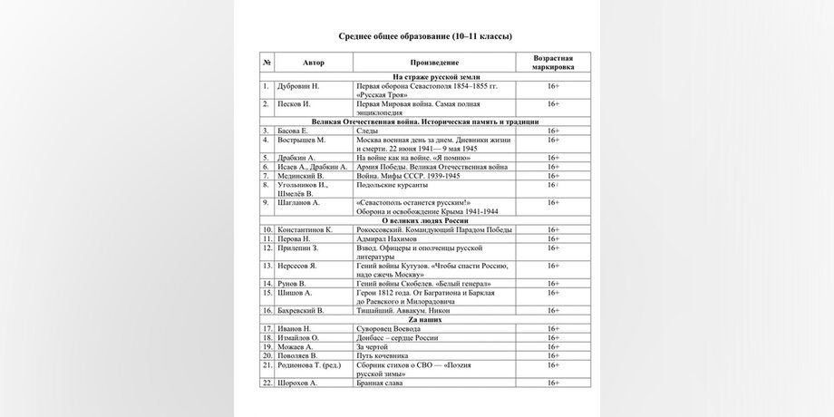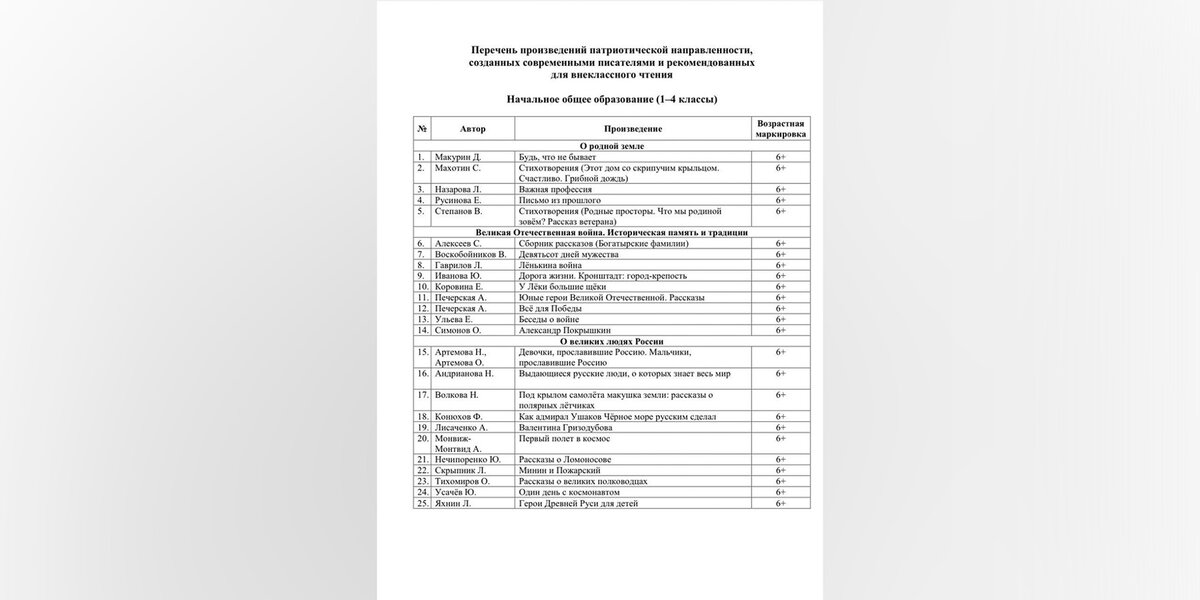 "Рекомендации разработаны по итогам заседания Совета при президенте Российской Федерации по реализации государственной политики в сфере поддержки русского языка и языков народов Российской Федерации. Актуальный перечень произведений для внеклассного чтения включает работы современных авторов, направленные на патриотическое воспитание школьников", – рассказали в Минпросвещения РФ.
