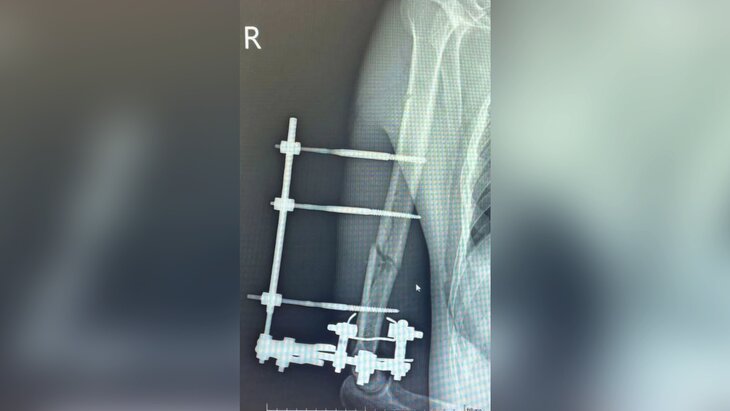 Заведующий травматологическим отделением больницы Роберт Миллер рассказал, что, когда пострадавший мужчина поступил в стационар, его рука держалась только на мягких тканях. Изначально был риск потери руки, однако ее удалось спасти. Врачи выполнили хирургическую обработку, зафиксировали конечность в правильном положении, а затем провели остеосинтез аппаратом Илизарова.