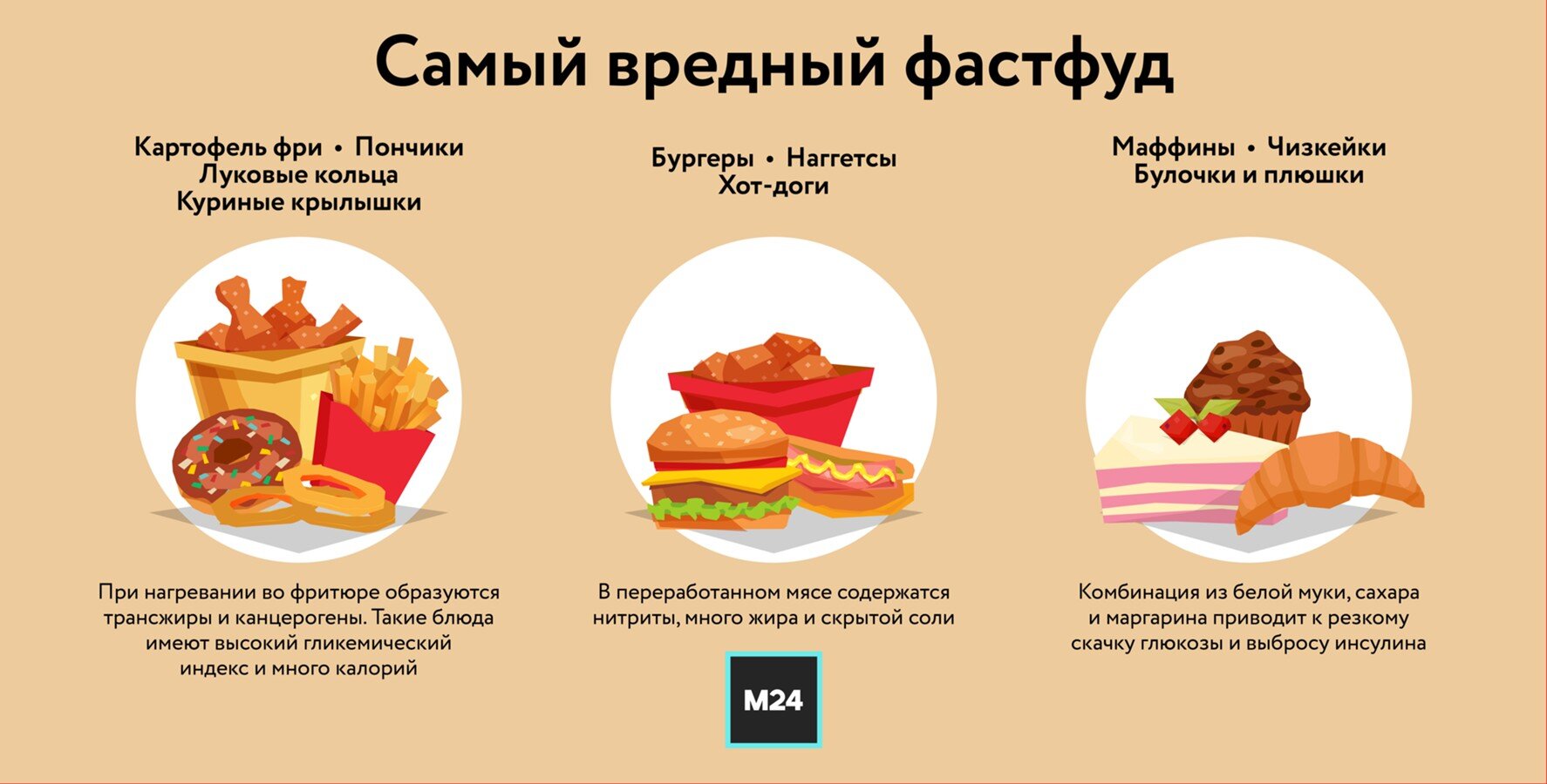По ее словам, все эти блюда готовят во фритюре, то есть в масле, которое многократно нагревается. При высоких температурах в нем образуются трансжиры и канцерогены, такие как акриламид.