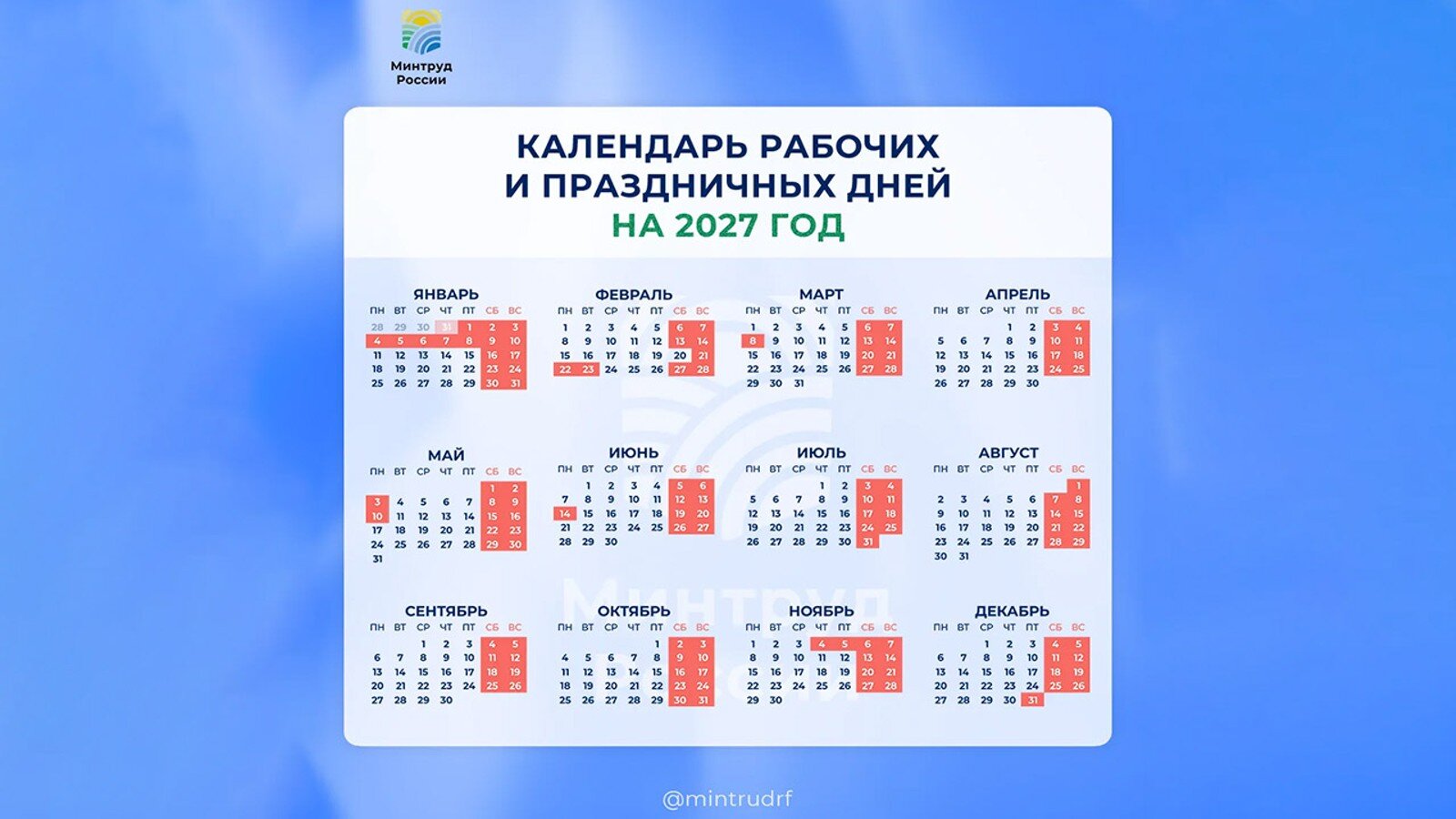"Правительство РФ ежегодно переносит выходные дни, выпадающие на праздничные, чтобы оптимально распределить время труда и отдыха. По возможности праздничные и выходные дни объединяются", – отметил министр труда и социальной защиты России Антон Котяков.