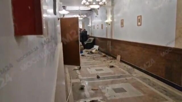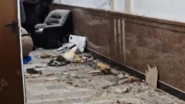 В здании повреждены остекление и гипсокартонный потолок. Также по кадрам видно, что частично разрушен пол. Кроме того, в проходе обвалились элементы внутренней отделки, некоторые из них сгорели, и стекла с первого этажа. Кресло, под которым, возможно, было расположено СВУ, разорвало на части.