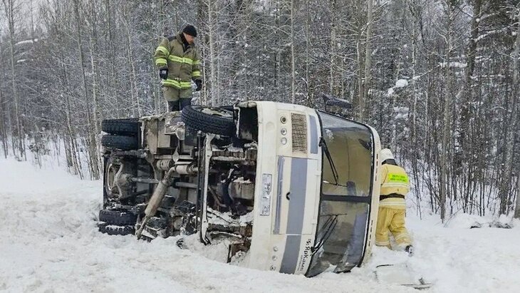 По предварительным данным, водитель не смог справиться с управлением на повороте, после чего автобус занесло. Он задел дорожную бровку и завалился на бок.