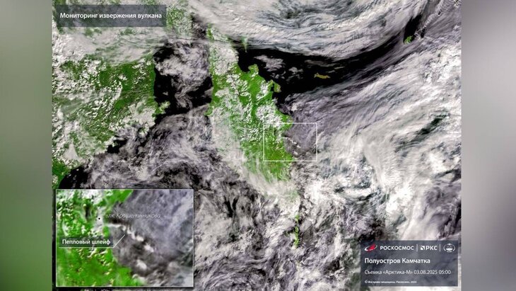 "Спутники "Роскосмоса" зафиксировали извержение вулкана Крашенинникова. На снимках виден пепловый шлейф. Высота пеплового выброса достигает 5–6 километров над уровнем", – говорится в сообщении.