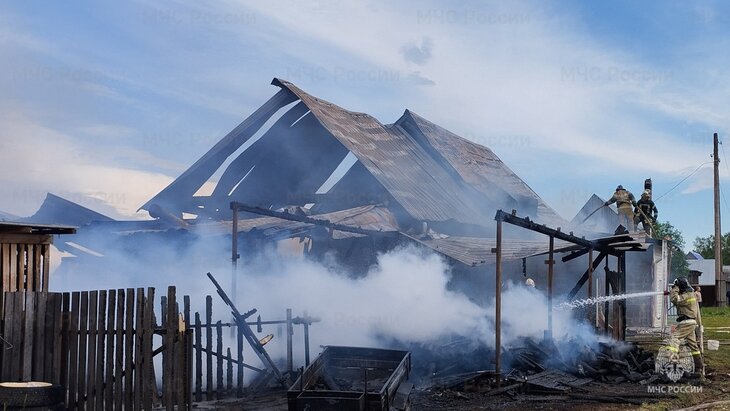"По прибытии к месту вызова первого подразделения происходило горение жилого дома с надворными постройками. Предварительно: причиной пожара могли послужить грозовые разряды", – уточнили в МЧС.