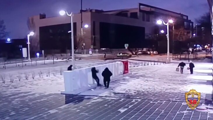 По данным ведомства, двое мужчин нанесли удары по красному знаку из стеклянной руны и разбили одну из букв конструкции университета.