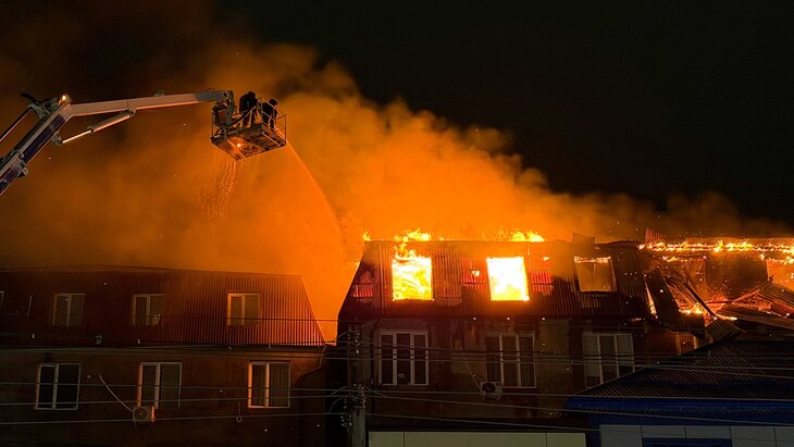 Частично обрушилась кровля здания, она упала на стоящие рядом постройки. Спасатели эвакуировали из дома 75 жильцов, в том числе 24 ребенка. К тушению огня были привлечены 44 человека и 14 единиц техники МЧС.К настоящему моменту открытое горение ликвидировано. Жертв и пострадавших в результате пожара нет.