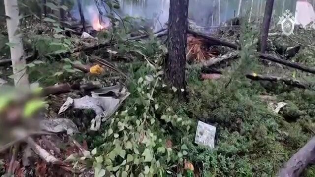На видео заметны обломки воздушного судна в лесной местности. Некоторые из них дымятся и горят.