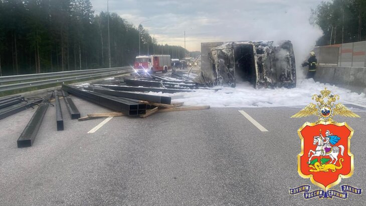 Грузовик столкнулся с автомобилем, опрокинулся и загорелся на 62-м километре автодороги М-12 в сторону Москвы в Ногинске. Об этом сообщается в телеграм-канале регионального управления МВД РФ.