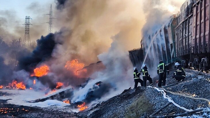 По уточненной информации, в результате ДТП 16 вагонов опрокинулись и загорелись. Из них – 12 цистерн с бензином и 4 вагона с пиломатериалами. Машинист и его помощник отказались от госпитализации.
