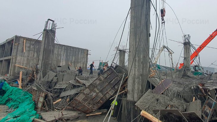Обрушение строящегося здания в Южно-Сахалинске произошло 28 ноября. По предварительным данным, часть двухэтажной постройки рухнула при заливке бетоном.
