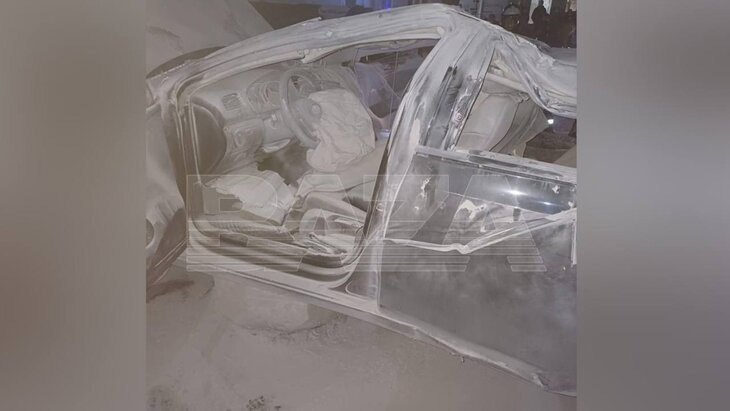 В настоящий момент огнеборцы занимаются ликвидацией возгорания, которое возникло после падения автомобиля. Площадь пожара составляет пять квадратных метров.
