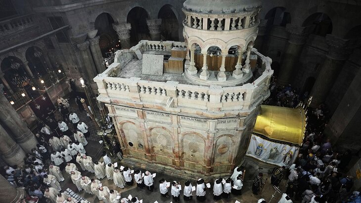 Благодатный огонь в преддверии Пасхи каждый год появляется в Кувуклии – часовне над ложем Гроба Господня в Иерусалиме. Для этого верующие молятся в храме, а после в часовне ищут огонь и опечатывают ее. Затем патриарх Иерусалимский снимает торжественное облачение, чтобы было видно, что он не проносит в здание источников огня. После он входит в Кувуклию, где гасят свет в ожидание чуда.