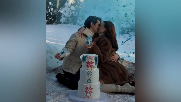 Пара обменялась взаимными пожеланиями и разрезала специально приготовленный торт. Внутри оказалась начинка голубого цвета. Так возлюбленные узнали, что у них родится мальчик.