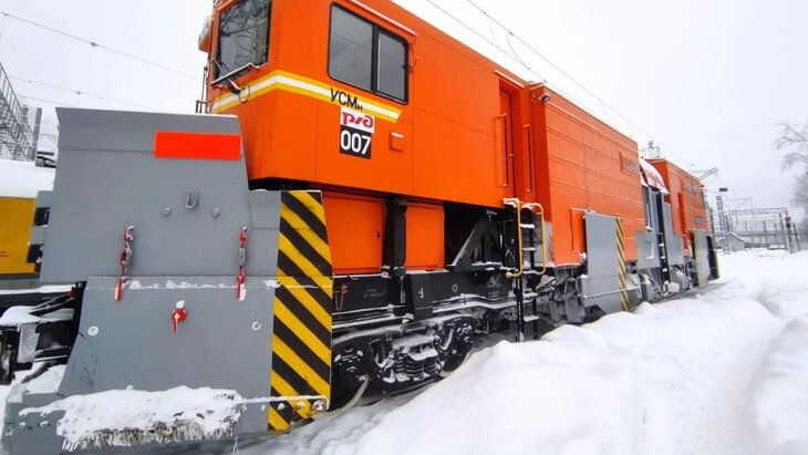 Отмечается, что несамоходная машина произведена в России. У нее есть отвальные устройства, благодаря которым с пути убираются сугробы до 1,5 метра в высоту. Пневмоочистительная установка при помощи воздушного потока убирает снег в межрельсовом пространстве, а также на стрелочных переводах.