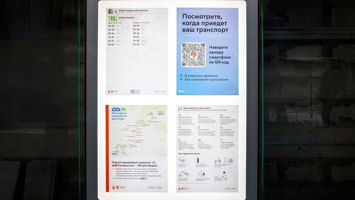 На остановках также есть стенды с информацией об интервалах движения и картой маршрута. Это помогает пассажирам в том числе узнать о достопримечательностях, которые они увидят, пользуясь Московским трамвайным диаметром. Также там указаны станции метро и МЦД, на которые можно пересесть. На остановках есть и цифровые табло с временем прибытия трамвая, это относится и к Т1.