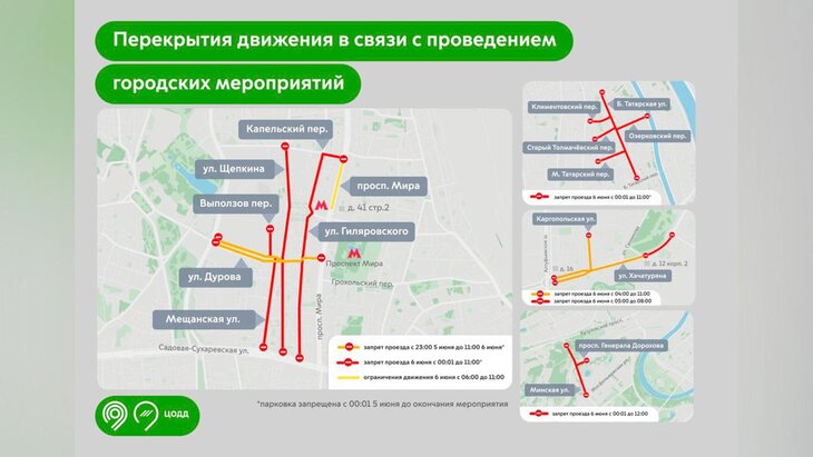 С 23:00 5 июня до 11:00 следующего дня нельзя будет проехать по участку улицы Дурова от проспекта Мира до Олимпийского проспекта. Также 6 июня с 00:01 до 11:00 закроется проезд по улицам Щепкина, Мещанской, Гиляровского, Большой Татарской, а также в Капельском, Выползове, Старом Толмачевском, Малом Татарском, Климентовском и Озерковском переулках. Парковать автомобили на этих улицах будет запрещено с 00:01 5 июня до завершения мероприятия.