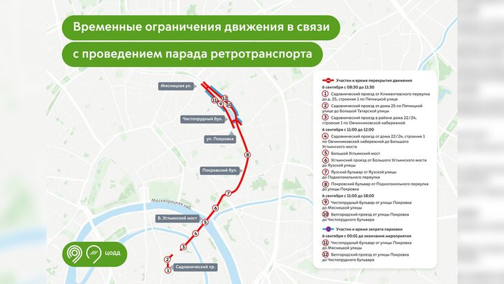 С 08:30 до 11:30 нельзя будет проехать по участкам Садовнического проезда, с 11:00 до 12:00 (краткосрочно) – в Садовническом и Устьинском проездах, по Большому Устьинском мосту, Яузскому и Покровскому бульварам, с 11:00 до 18:00 – по Чистопрудному бульвару и в Белгородском проезде.