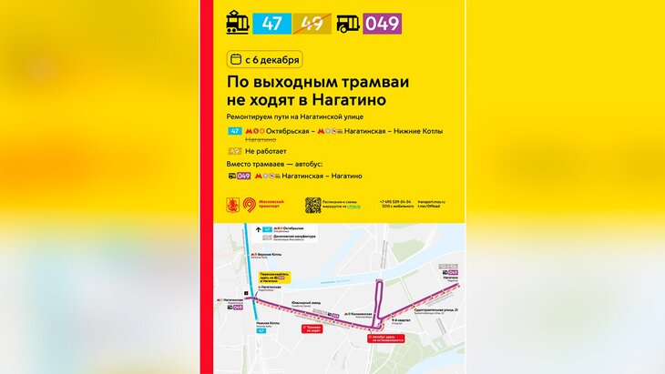 Уточняется, что маршрут № 47 пойдет от станции метро "Октябрьская" через "Нагатинскую" до Нижних Котлов, а трамвай № 49 не будет курсировать вообще.