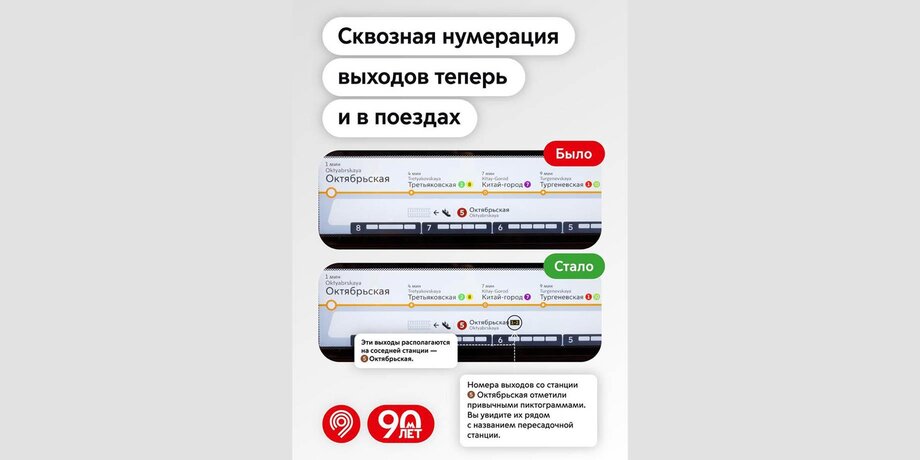 Новая система предусматривает отображение пиктограммы с номером выхода рядом с обозначением пересадки на соседнюю линию. Это позволит пассажирам заранее определить расположение нужного выхода, даже если он находится на станции соседней линии метро.