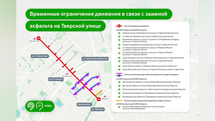 С 21:00 пятницы, 15 августа, до 05:00 понедельника, 18-го числа, будет закрыт участок на Тверской улице от Бульварного кольца до 1-й Тверской-Ямской улицы, а также на 1-й Тверской-Ямской от Тверской до Лесной.