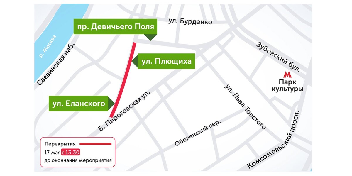 Перекрытия будут действовать в том числе в центре города. Водители транспорта не смогут проехать по одной полосе в каждом направлении на Зубовской улице от Дашкова переулка до Большой Пироговской улицы, на Большой Пироговской улице от Зубовской улицы до улицы Еланского и в проезде Девичьего Поля от улицы Плющихи до Зубовской улицы с 15:00 до 23:59 16 мая и с 20:00 до 23:00 17 мая.