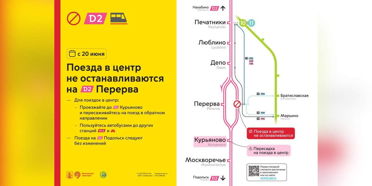Однако с 20 июня пассажиры должны отправиться с платформы "на Подольск" до Курьянова и бесплатно пересесть на встречный поезд, чтобы добраться до центра Москвы со станции Перерва. Для того чтобы добраться до Перервы из Подольска, пассажирам нужно дойти до станции Депо и сесть в поезд обратного направления.