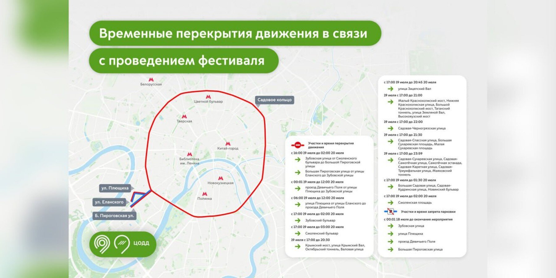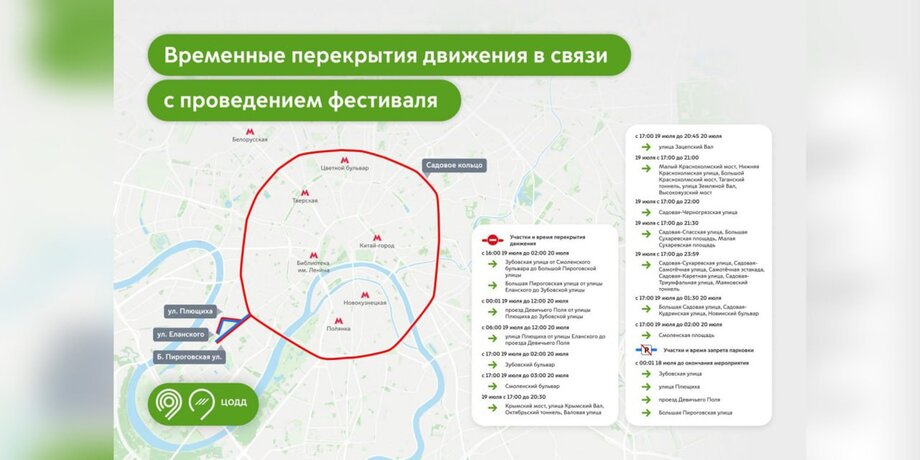 С 00:01 18 июля и до финала мероприятия нельзя парковаться на Плющихе, Зубовской, Большой Пироговской улицах и в проезде Девичьего Поля. С 00:01 19 июля до 12:00 20 июля остановят движение на участке проезда Девичьего Поля от улицы Плющихи до Зубовской улицы. С 06:00 19 июля до 12:00 20 июля будет перекрыт участок улицы Плющихи от улицы Еланского проезда до Девичьего Поля.