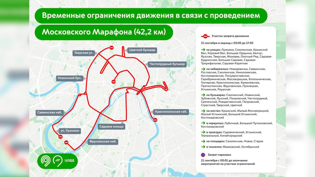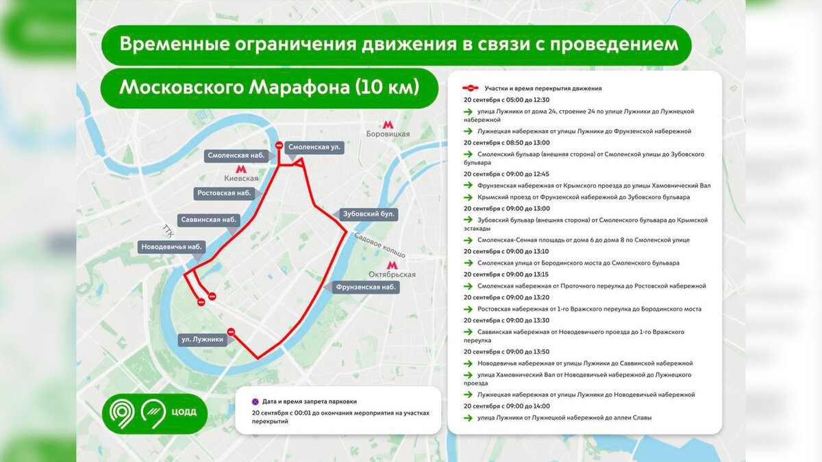 В субботу, 20 сентября, с 05:00 до 12:30 будет закрыт участок улицы Лужники от дома 24, строения 24, до Лужнецкой набережной. В воскресенье, 21 сентября, аналогичные ограничения будут действовать с 03:00 до 12:30. Также с 05:00 до 12:30 20 сентября и с 03:00 до 11:30 21 сентября будет недоступна Лужнецкая набережная от улицы Лужники до Фрунзенской набережной.