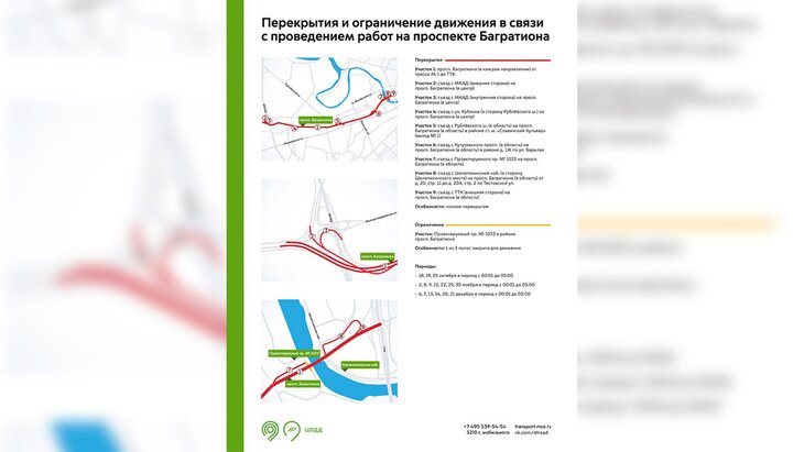 Помимо этого, движение на проспекте Багратиона будет ограничено с 00:01 до 05:00 2, 8, 9, 15, 22, 29 и 30 ноября, а также 6, 7, 13, 14, 20 и 21 декабря. В эти же временные интервалы будет недоступно движение на одной из полос на участке Проектируемого проезда № 1033.