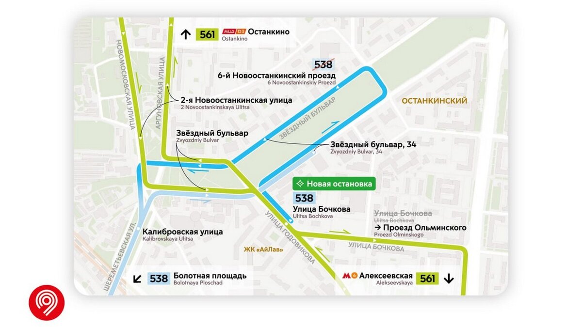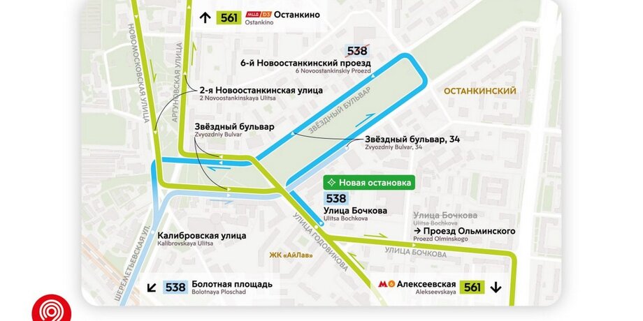 Маршрут № 538 теперь работает с остановки "Улица Бочкова". Электробусы № 561 также будут там останавливаться. Таким образом, жители ЖК в Останкинском районе получат удобный и экологичный транспорт прямо недалеко от домов.