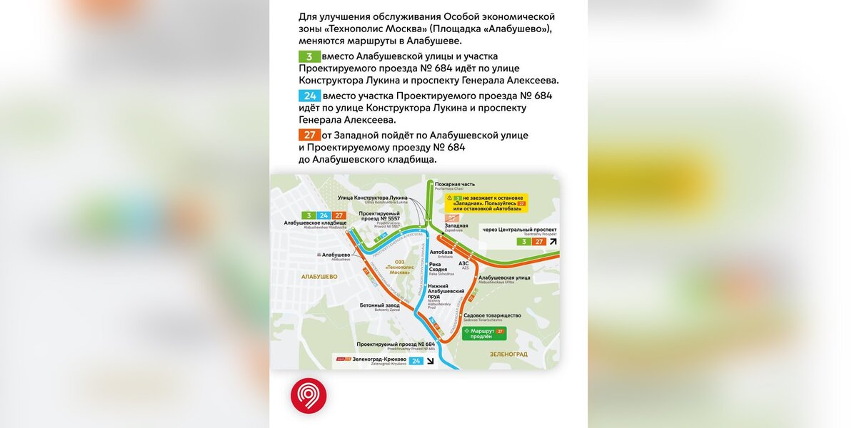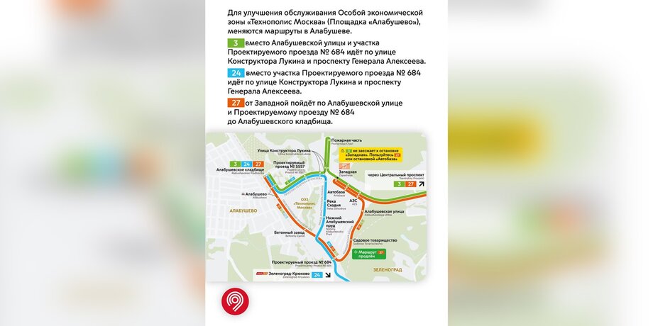 Маршрут № 3 вместо Алабушевской улицы и участка Проектируемого проезда № 648 будет курсировать по улице Конструктора Лукина и проспекту Генерала Алексеева. По указанным улицам также поедет автобус № 24, а маршрут № 27 от Западной пойдет по Алабушевской улице и Проектируемому проезду № 648 до Алабушевского кладбища.
