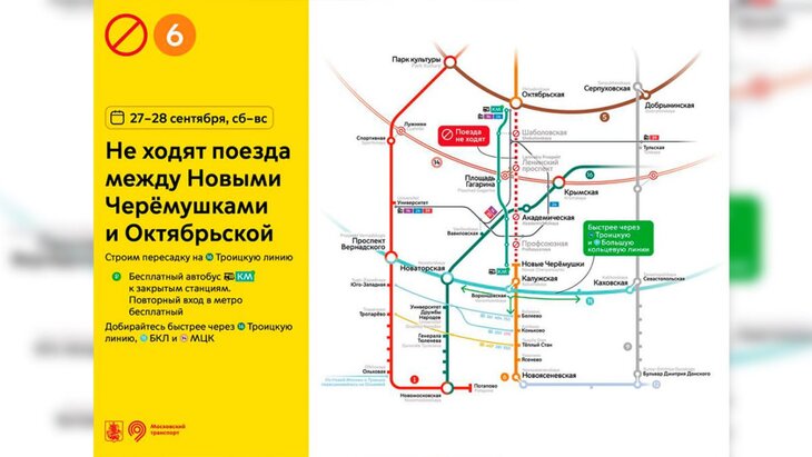 Поезда не будут курсировать на участке между станциями "Октябрьская" и "Новые Черемушки" Калужско-Рижской линии метро 27 и 28 сентября. Об этом сообщила пресс-служба столичного Дептранса.