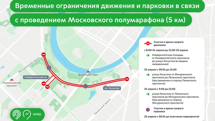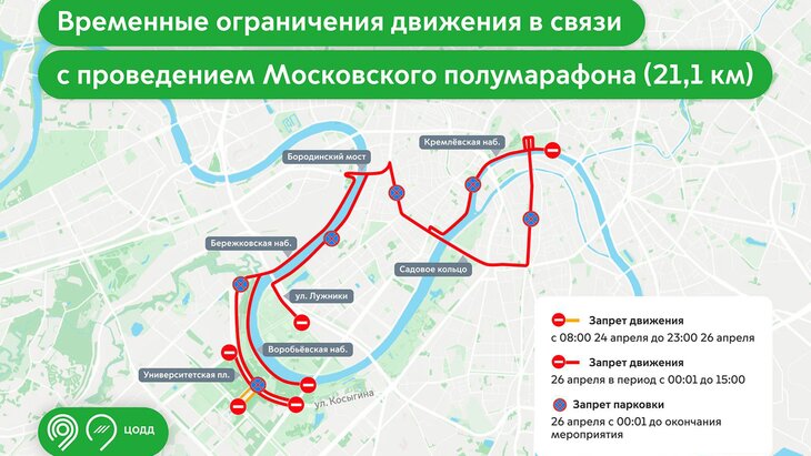 Кроме того, 26 апреля из-за полумарафона на 21,1 километра временно перекроют ряд улиц и набережных. С полуночи до 14:00 ограничат движение по улице Косыгина от проспекта Вернадского до Университетской площади в обоих направлениях.
