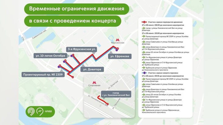 В эти дни с 08:00 до завершения концерта водители не смогут съехать с улицы Хамовнический Вал на улицу Доватора. Кроме того, с 20:00 до окончания мероприятия будет перекрыт проезд на улице Савельева, Доватора, 10-летия Октября, 3-й Фрунзенской, Ефремова, Трубецкой и в Проектируемом проезде № 2309.