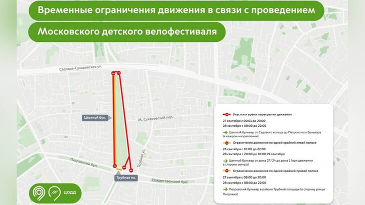 В субботу, 27 сентября, с 00:01 до 20:00 и на следующий день с 08:00 до 22:00 на Цветном бульваре не будет движения от Садового кольца до Петровского бульвара в каждом направлении.