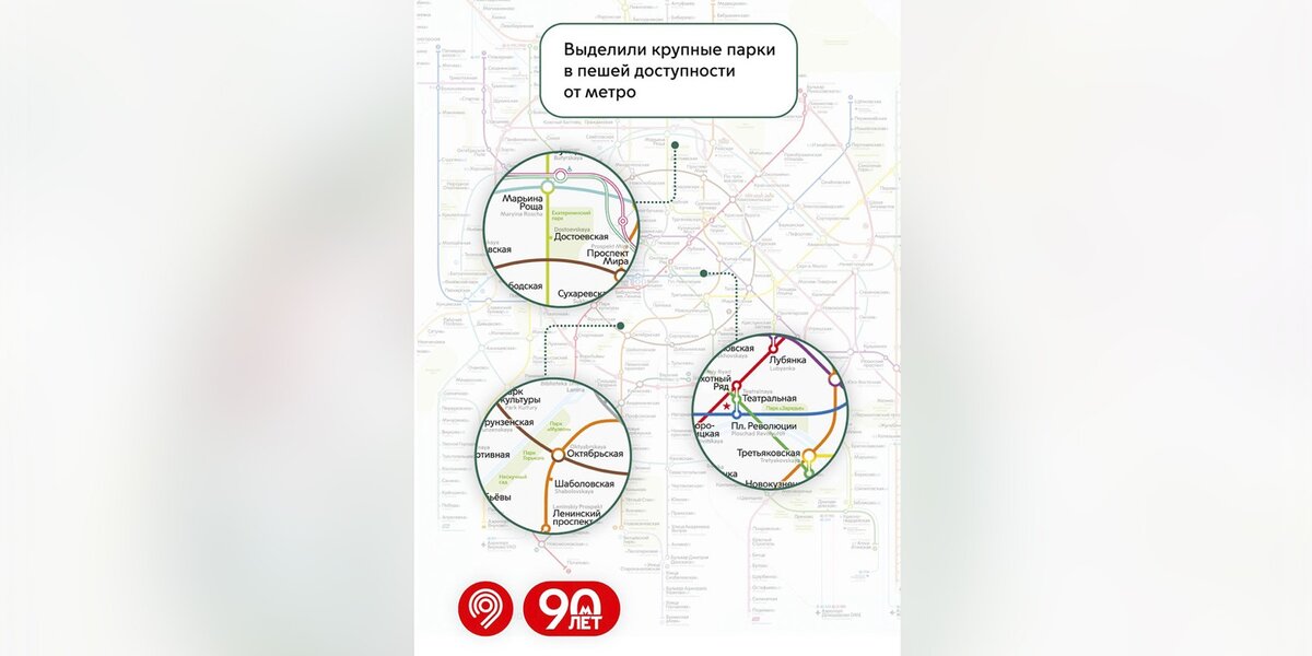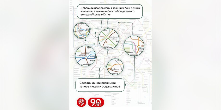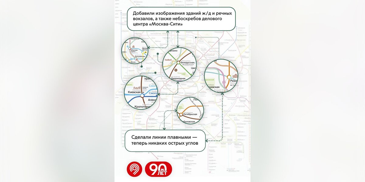 В новом дизайне сделали плавные линии и избавились от острых углов. На схеме появились обозначения крупных парков, которые находятся в пешей доступности от метро, а также иллюстрации зданий ж/д и речных вокзалов, небоскребов делового центра "Москва-Сити".