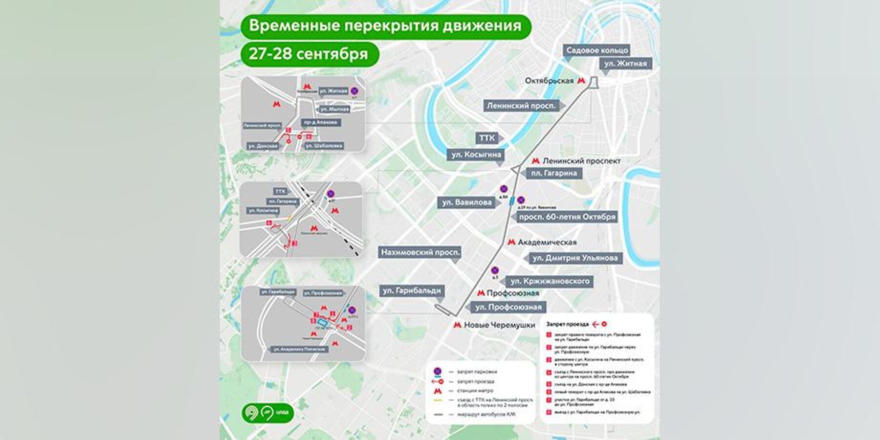 Кроме того, нельзя будет проехать по участку улицы Гарибальди от дома 28 до Профсоюзной улицы, а также по Профсоюзной улице через улицу Гарибальди. Закроют движение и с улицы Косыгина на Ленинский проспект в сторону центра.