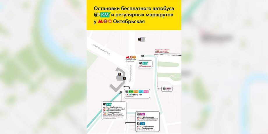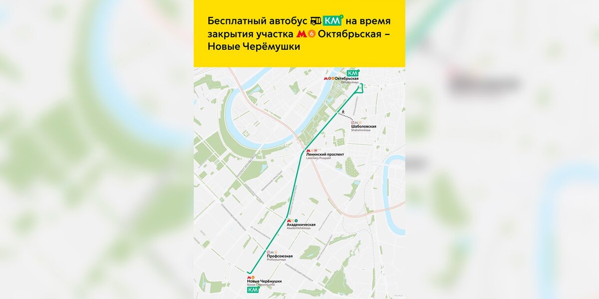 Около 60 автобусов КМ особо большого класса будут курсировать в период с 05:20 до 01:50 на участке, где приостановят движение поездов. В частности, общественный транспорт будет останавливаться рядом со станциями метро "Новые Черемушки", "Профсоюзная", "Академическая", "Ленинский проспект", "Шаболовская" и "Октябрьская".