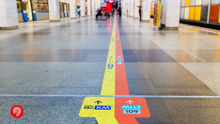 Специалисты присвоили свои цвета измененным и временным маршрутам транспорта. В результате на станции сделали более 200 метров цветных полос, которые приведут пассажиров к необходимому выходу и автобусам КМ.