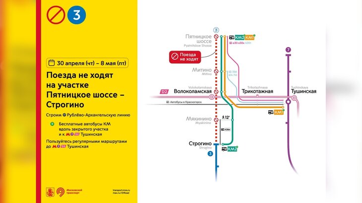 ТранспортУчасток между станциями метро "Строгино" и "Пятницкое шоссе" закроют с 30 апреля по 8 мая