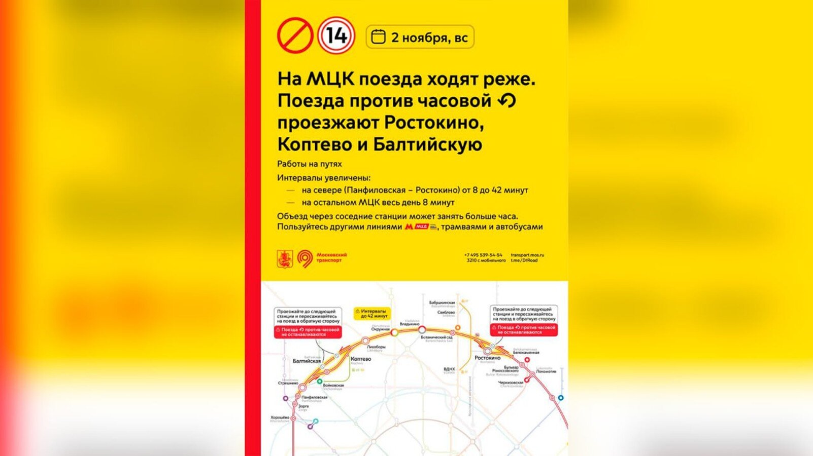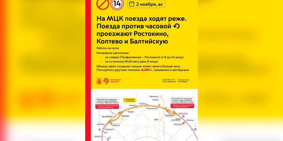 Также сообщалось, что 30–31 октября изменится движение поездов на Белорусском и Савеловском направлениях МЦД-1. На участке от Савеловской до Бескудникова поезда будут ходить в обе стороны по одному пути, частично увеличатся интервалы движения. Пассажирам рекомендовано уточнять информацию на табло.
