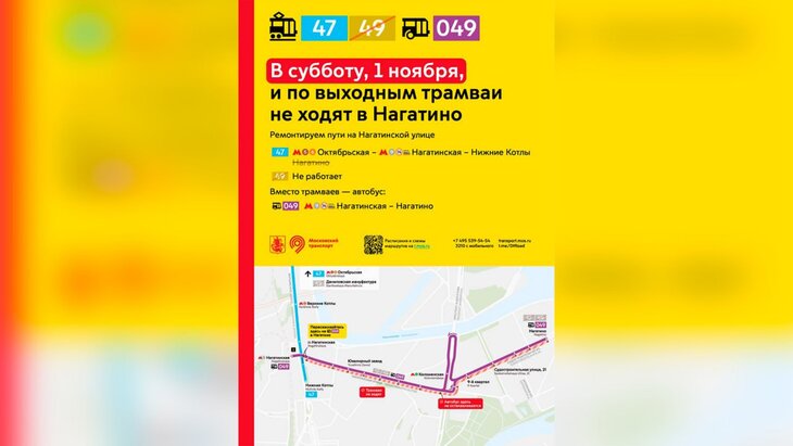 В эти дни трамвай № 47 пойдет по измененному маршруту. Он будет курсировать от станции метро "Октябрьская" через "Нагатинскую" до Нижних Котлов. Трамвай № 49 в это время работать не будет.